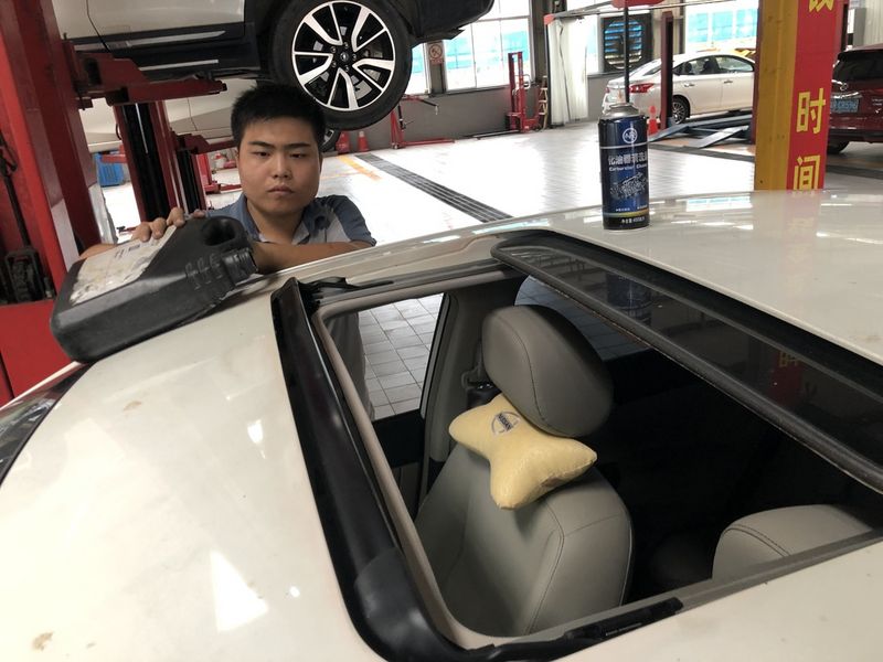 售后师傅除了清理天窗表面看得到的灰尘,隐藏在发动机舱边上的排水管同样需要清理,在天窗两边排水口倒水,测试水流是否可以顺利排出,排出速度快慢。在结束其他保养后,师傅会二次测试天窗的排水效果。