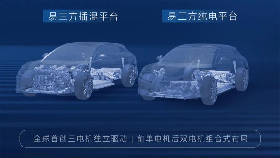 作为全球首个整车智能控制技术平台,易三方在全球首次实现了三电机独立驱动和后轮双电机独立转向技术融合控制,并充分融合第五代DM技术、e平台3.0 Evo等顶尖技术优势,将插混纯电同平台的动力架构、全球首创的三电机独立驱动+后轮双电机独立转向控制架构、智电融合的整车智能架构三大架构完美融合。