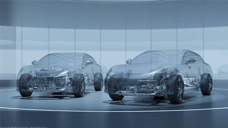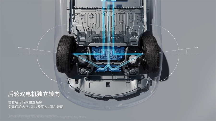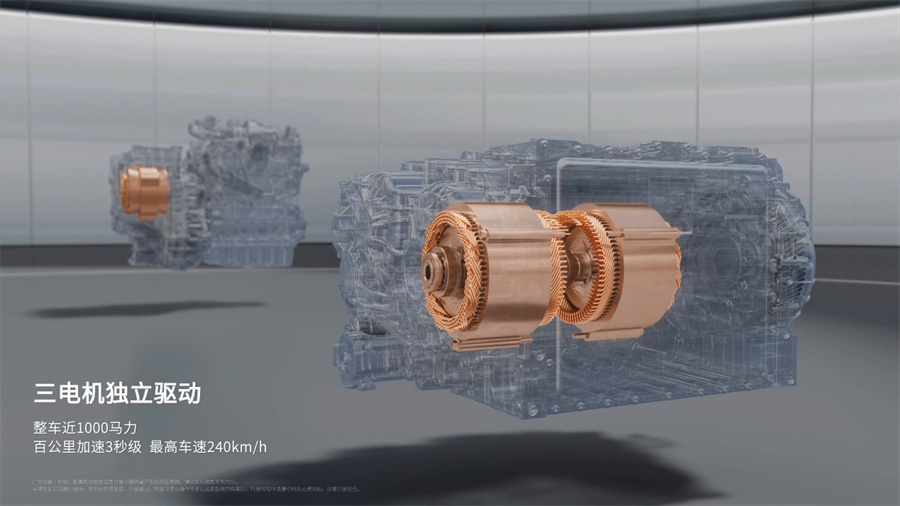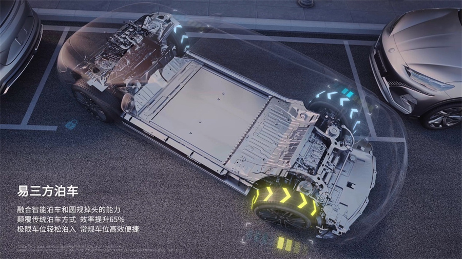 3、三大架构:易三方将插混纯电同平台的动力架构、全球首创的三电机独立驱动+后轮双电机独立转向控制架构、智电融合的整车智能架构三大架构完美融合。