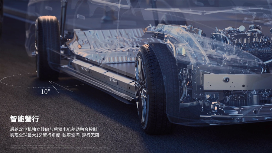 智能蟹行开启后前后轮同向转动,可通过双向20°的全球最大后轮转角,实现15°的全球最大蟹行角度,变道更灵活,避障更从容,停车更轻松。