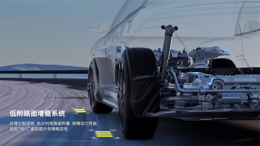 低附路面增稳系统可在低附、对开路面行驶时维持车辆稳定,提升车辆在冰雪、积水路面行驶时的稳定性,在保障行车安全的前提下提高行车速度。