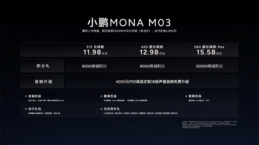 作为小鹏汽车新十年的开山之作,小鹏MONA M03在发布会上正式亮相并上市。新车共有三款车型,售价区间为11.98万元至15.58万元,实现了智油同价。