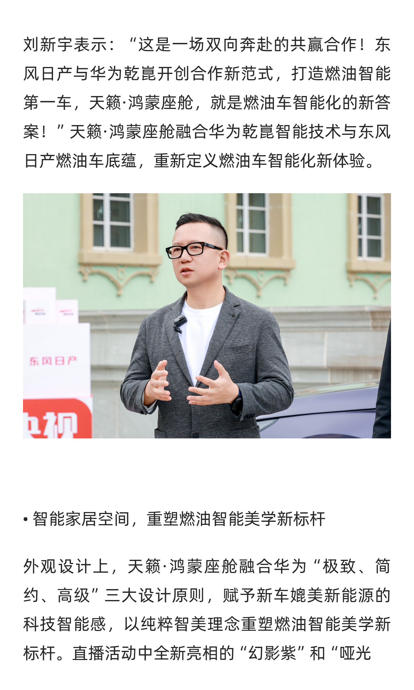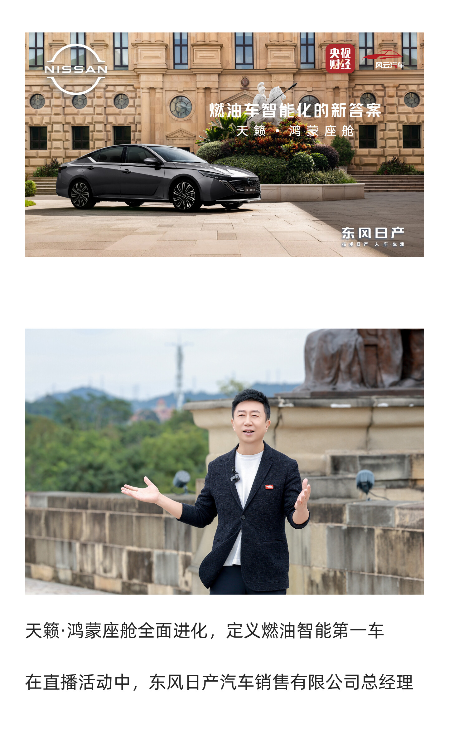 (导语)10月31日,央视财经“风云汽车”暨东风日产天籁·鸿蒙座舱全球首发亮相直播活动,于华为园区圆满举行。活动现场,东风日产与华为乾崑围绕“燃油车智能化的新答案”这一主题展开了深度交流与探讨。双方携手开创合作新范式,首个落地成果天籁·鸿蒙座舱正式惊艳亮相。