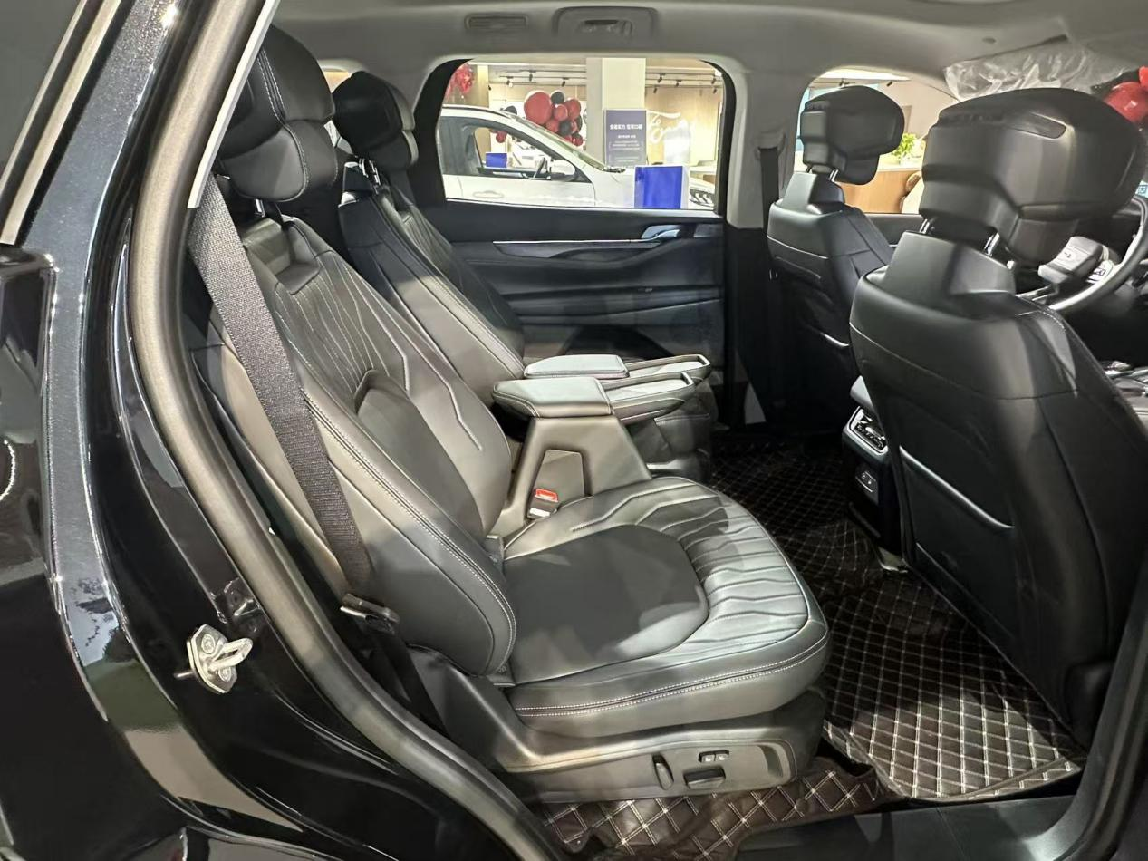 我特意去第三排试了试,以我1米75的身高,在第二排留有一拳腿部空间的情况下,坐到第三排,膝盖刚好顶到第二排椅背,但还不至于特别憋屈,短途应急或者坐小孩是完全没问题的。比很多同尺寸但采用232布局的SUV的第三排要实用得多。销售小哥说顶配旗舰型的第二排座椅更奢华,用的是和某些百万豪车同款的半苯胺真皮,我们过去摸了摸,确实手感更细腻柔软,不过考虑到预算,至尊版的皮质已经相当不错了。