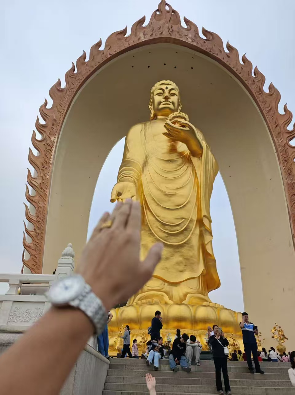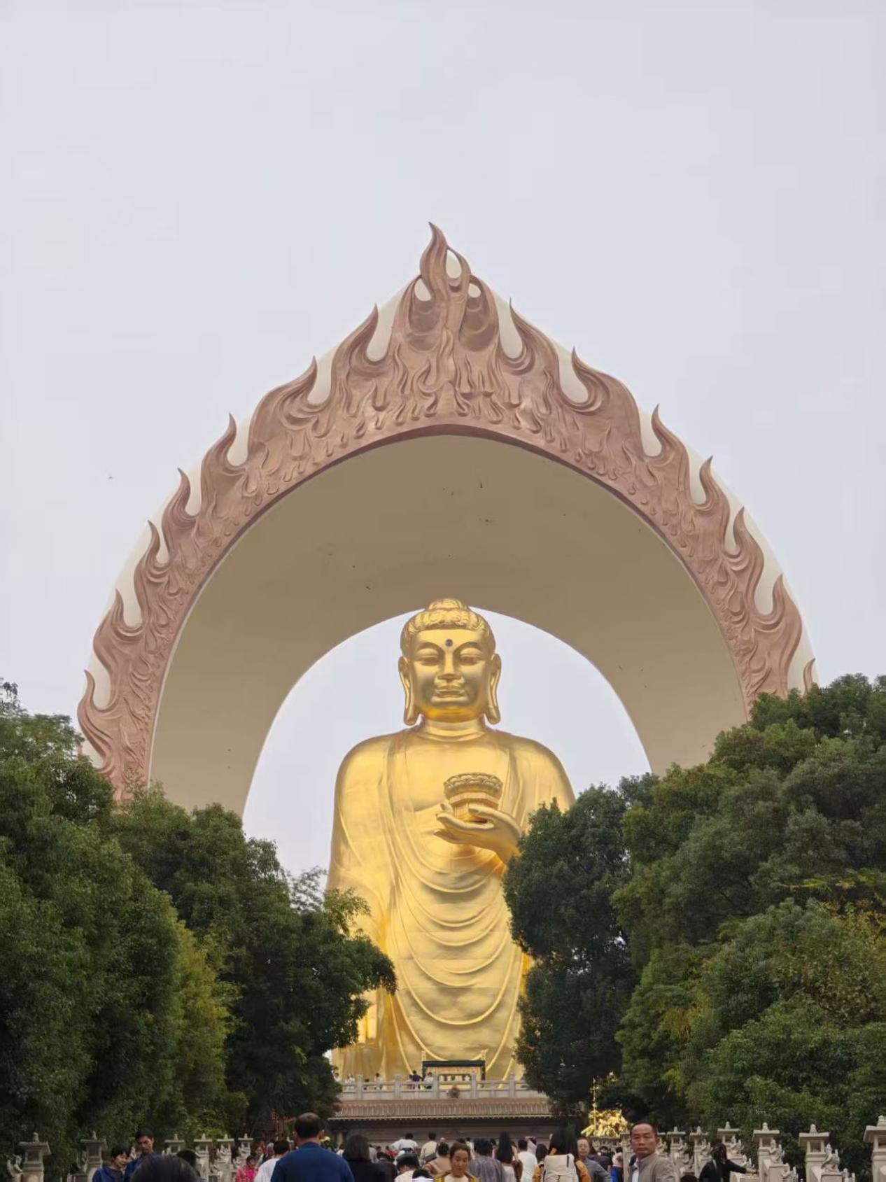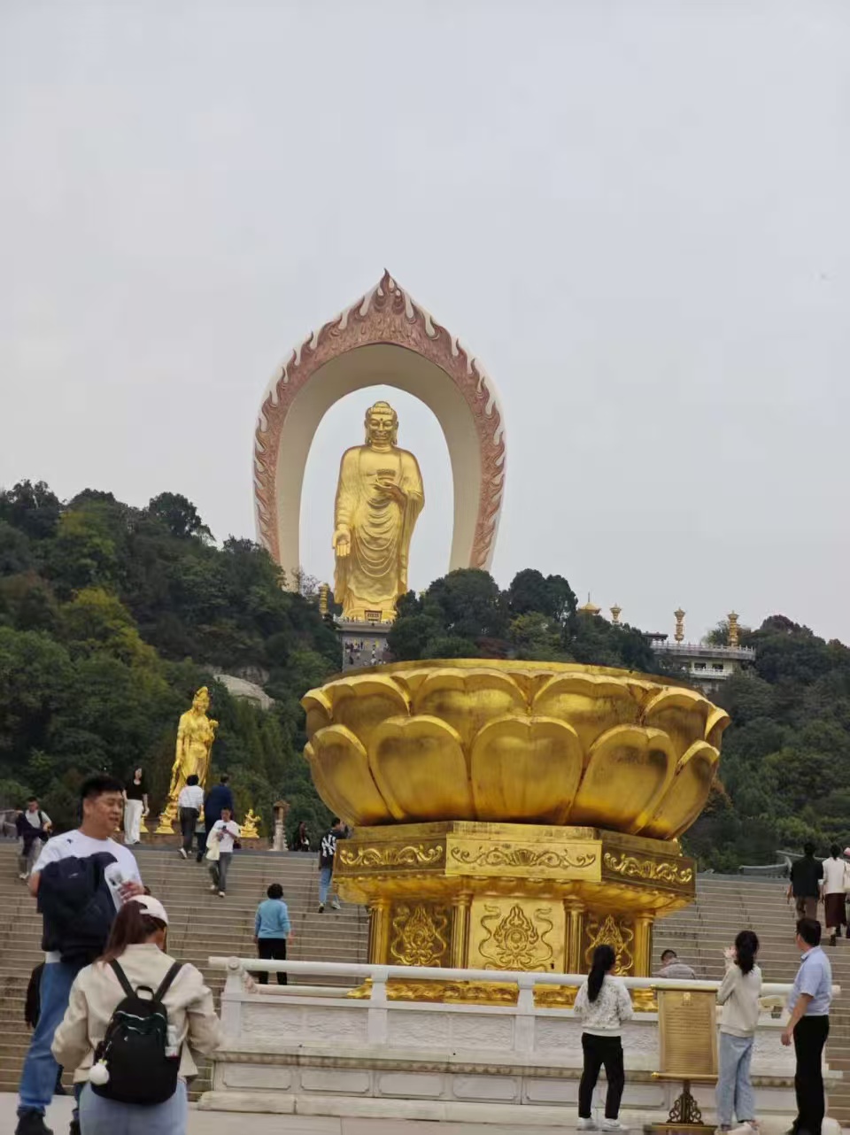 站在山脚下往上看,金灿灿的大佛矗立在山顶,特别壮观。沿着台阶往上走,沿途的风景也特别美,绿树成荫,空气清新,偶尔还能听到鸟鸣声。爬到山顶,近距离感受大佛的威严,所有的疲惫都烟消云散了。跟发小在大佛前拍了不少照片,还许了愿,心里特别满足。