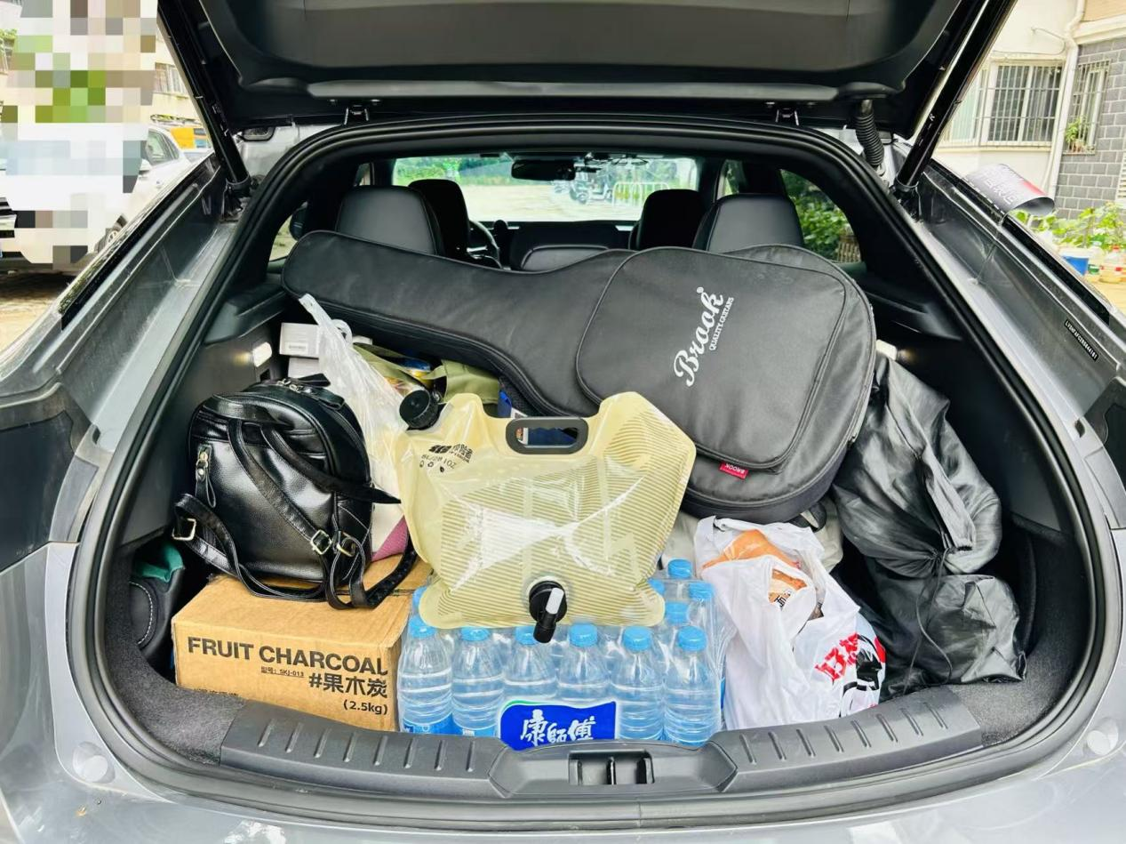我们的准备很充分,一大箱木/炭、一箱矿泉水、一大包零食,还有露营桌椅和食材,吉他也带上了哈哈哈,还有行李,所有东西一股脑塞进去还剩不少空间,跟开挂一样能装,这装载能力对于长途自驾太重要了!