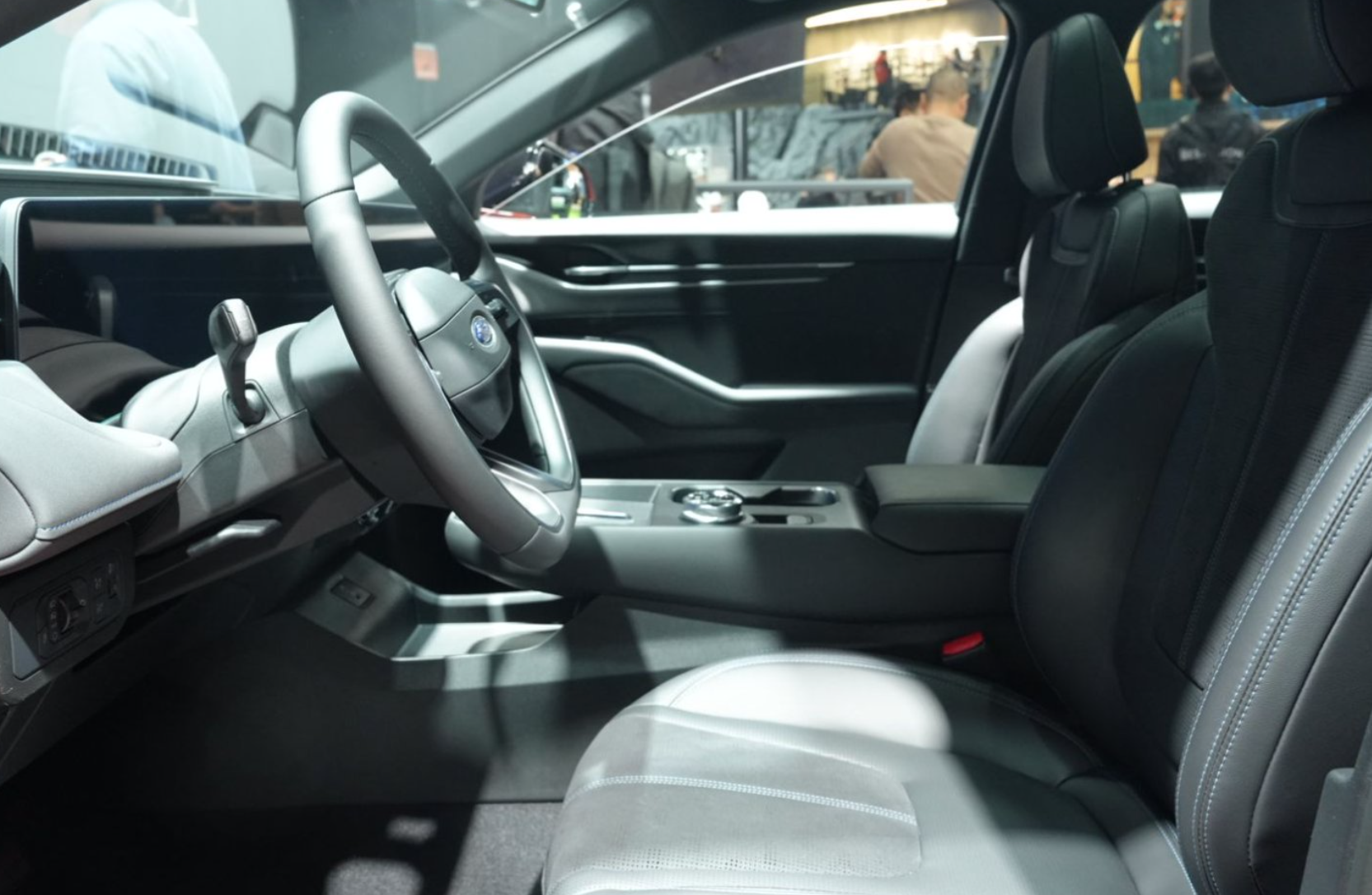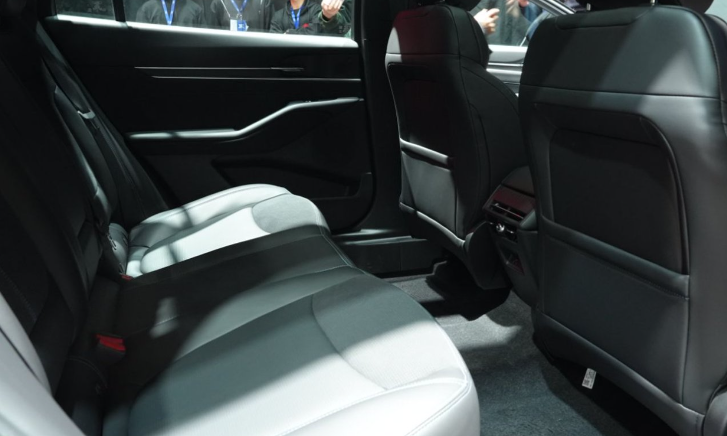 排了挺久的队,终于轮到我坐进车感受了。没啥犹豫的,直接调后排。2945mm轴距真不是吹,我165cm身高,后排腿部空间居然超过1米,同行闺蜜更是直接翘腿刷剧,也太爽了。地台拿矿泉水瓶比了比,突起还没瓶底高,中间坐人腿能随便放。虽然没法试驾,但261匹马力+408牛•米的参数摆在那儿,想想加速就爽。