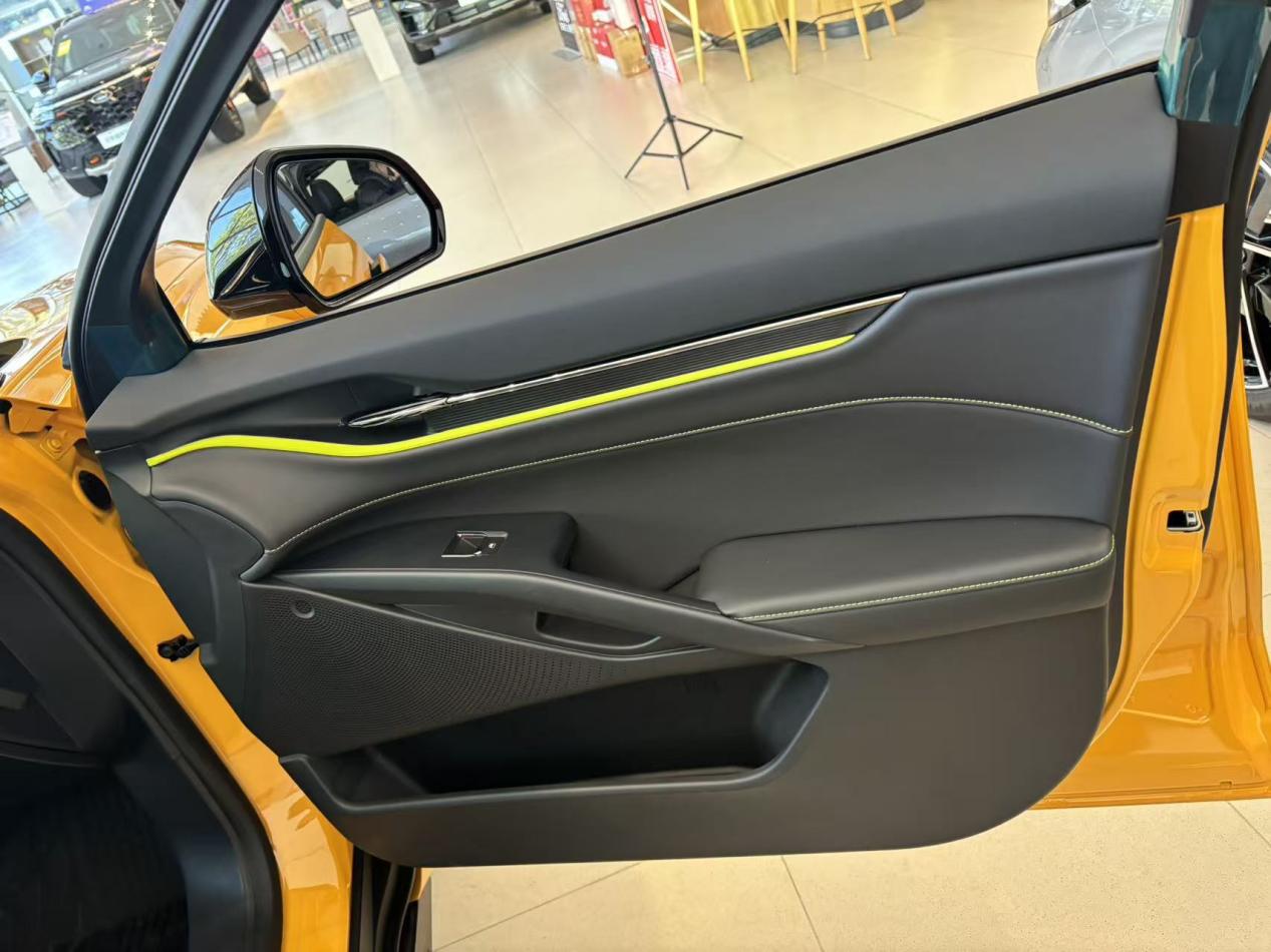 最吸睛的就是27英寸4K大屏,分屏功能绝了,主驾看导航副驾能追剧,以后自驾游也不怕副驾无聊。不过我有点担心大太阳下会不会反光?今天试驾的时候没注意到这个问题,有车主来说说吗?这个版本的座椅是织物和皮混搭材质,绿色缝线看着像电竞椅,包裹性超强,我183cm坐前排,头顶还有一拳余量,一点不压抑。