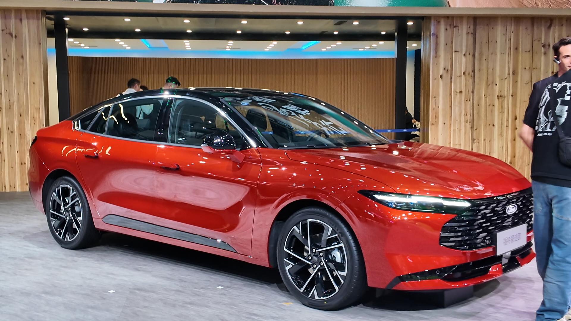 趁着有空去看了下新款蒙迪欧,展车是赤霞红色的,这个颜色在灯光下看挺显档次的,不是那种很飘的红,漆水感觉很厚实。整车的设计风格确实挺有力量感的,车头宽宽的,线条也比较硬朗,是我喜欢的那种感觉。