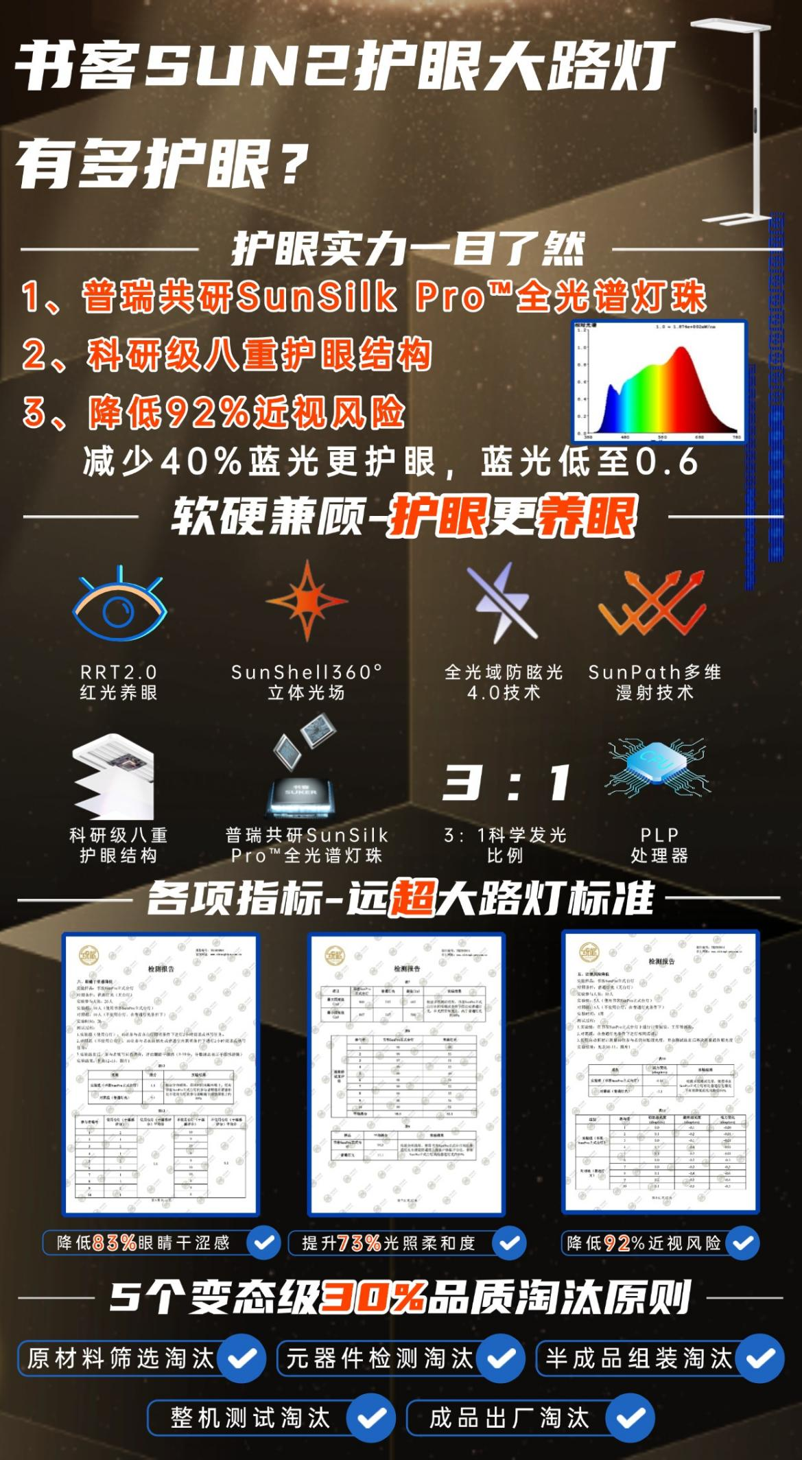 传统LED的护眼思路大多依赖滤光膜削弱蓝光,但滤除不彻底,且会破坏光谱均衡。书客Sun2 则从发光芯片源头进行结构性优化,与美国普瑞Bridgelux 联合定制 SunSilk Pro™ 类太阳全光谱灯珠,在芯片封装阶段便调整光谱成分,实现对有害蓝光(400–455nm)的精确压制,同时还融入了自研的RRT2.0红光养眼技术,提升绿光和红光波段比例,有效缓解83%视觉疲劳并降低92%视力下降风险,使输出光谱高度均匀、接近自然太阳光。