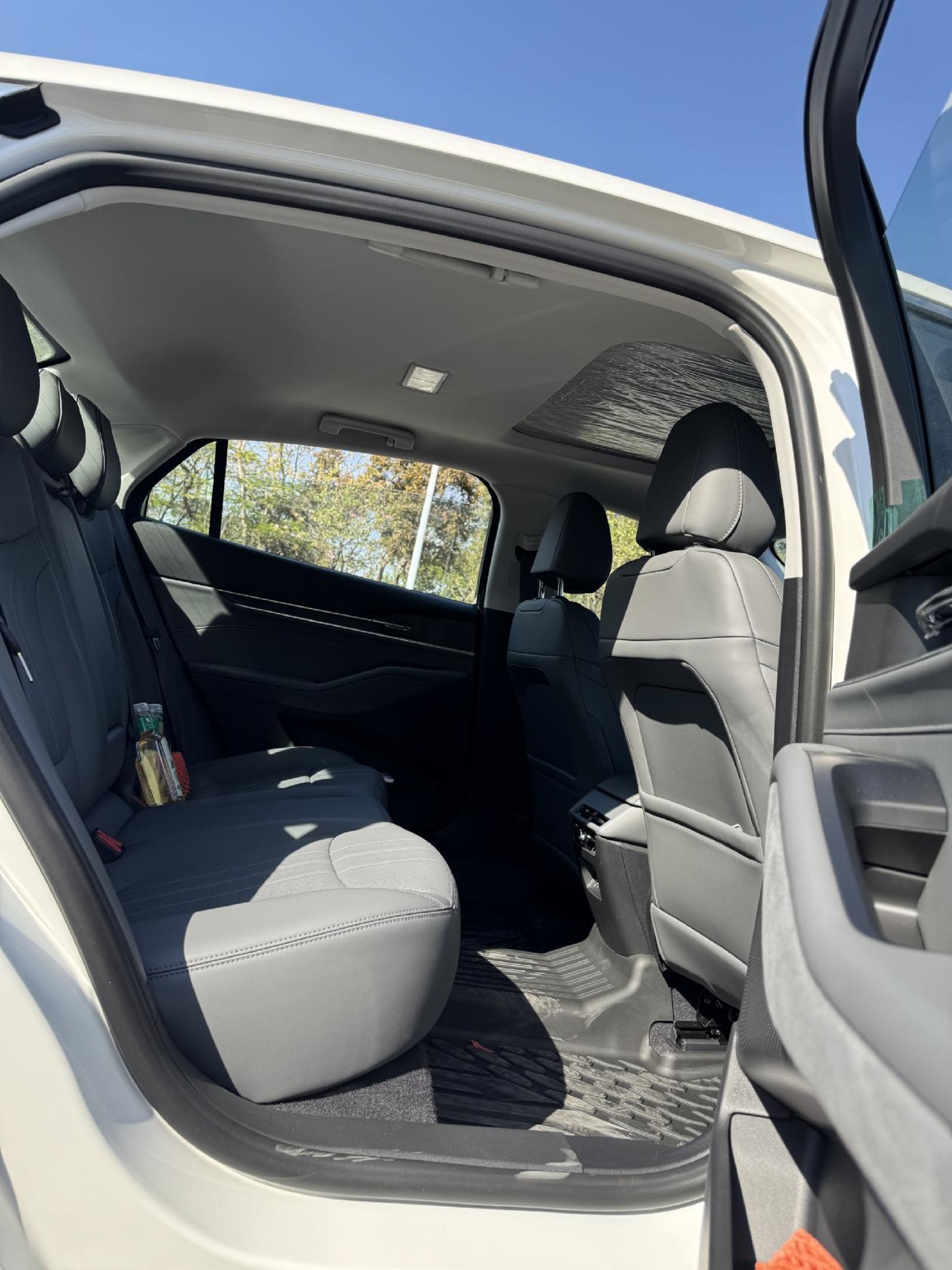 空间和舒适性这块,我身高180,坐后排腿部还有两拳多距离,翘个二郎腿没问题,头部空间也够,不压抑。后排地台隆起低,中间坐人腿脚能舒展开,不像有些车中间鼓个大包,坐久了腿麻。