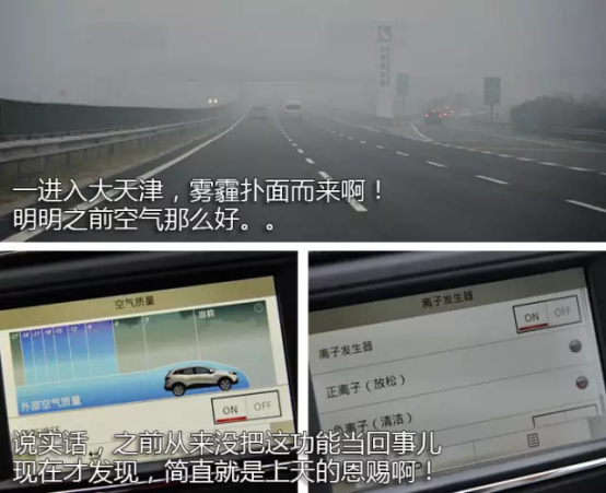 话说我没想到一进入天津污染就这么大,毕竟天津也是个沿海城市,还好科雷嘉有一个空气质量检测系统,但需要打开空调的自动循环,当检测到外面空气不好的时候会自动控制循环模式,同时可以打开正负离子发生器,保证车内的空气清新