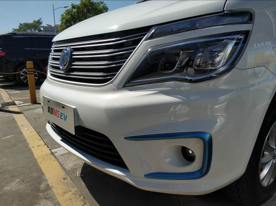 从上至下依次排列的是,示宽灯,头灯,雾灯,雾灯周围还有一圈蓝色的镀铬装饰着,凸显出新能源,环保的理念。