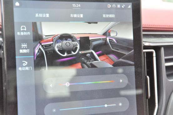 车子还有一个非常提高逼格的功能,那就是氛围灯了,有氛围灯和没有氛围灯那感觉简直是天差地别,而且风行T5还有16种颜色可以挑选,而且可以语音控制调色,真的太酷了!
