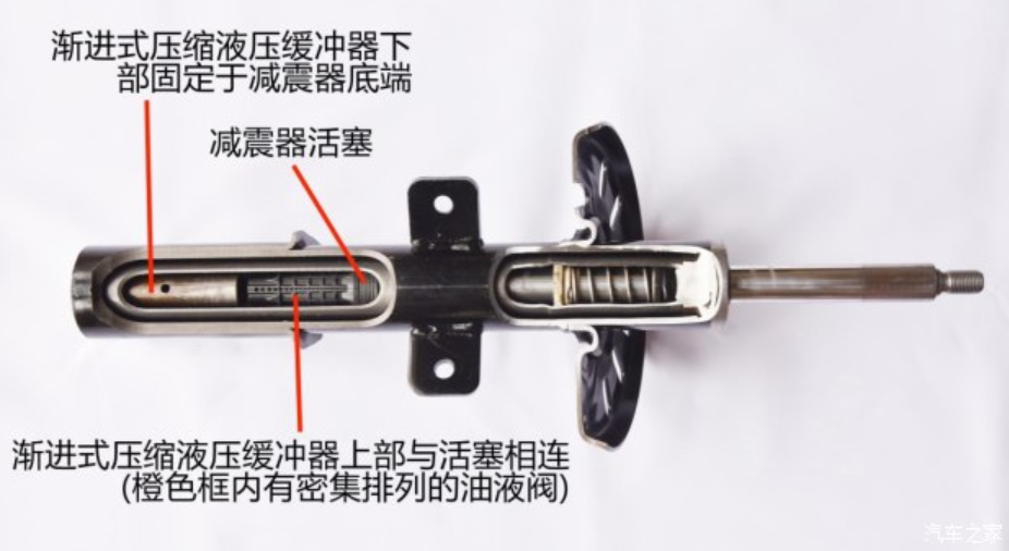 当路面颠簸大的时候,上图的活塞就下移了,与渐进式压缩液压缓冲器上下两部分开始接触,相当于PHC发挥缓冲作用了,随着活塞继续向下,减震器阻尼也越来越大,看活塞的孔,它是渐渐变小的,挤出油液达到阻尼渐大的效果,导致整个悬架对路面震动的吸收能力也增强,从而防止了那种生硬的冲击,人坐在车里面就舒服了,怎么冲它都不是硬的。
