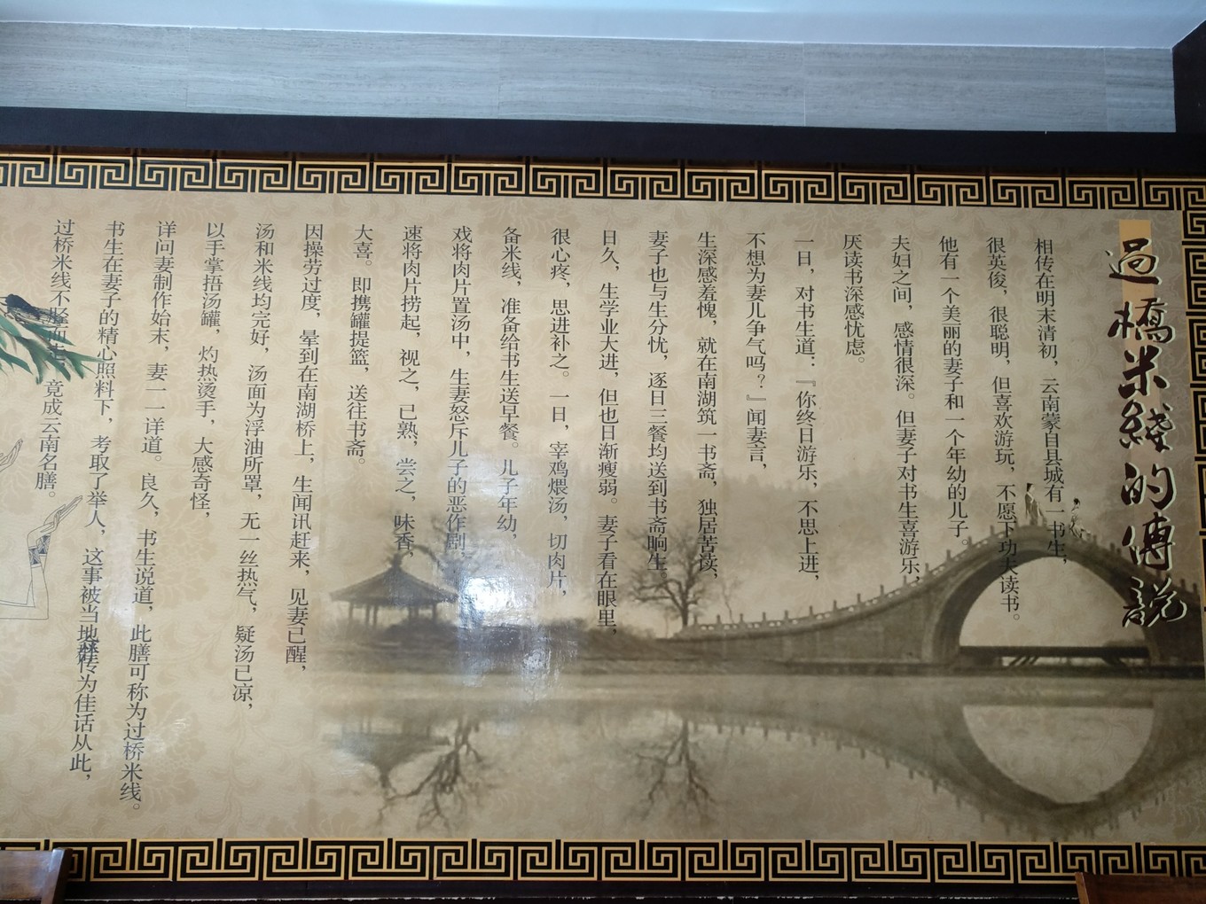 过桥米线的传说也有点意思,比淮扬菜动辄扯上乾隆皇帝的故事好多了。与娘子过桥送米线相比,红袖添香夜读书也不值得羡慕了。