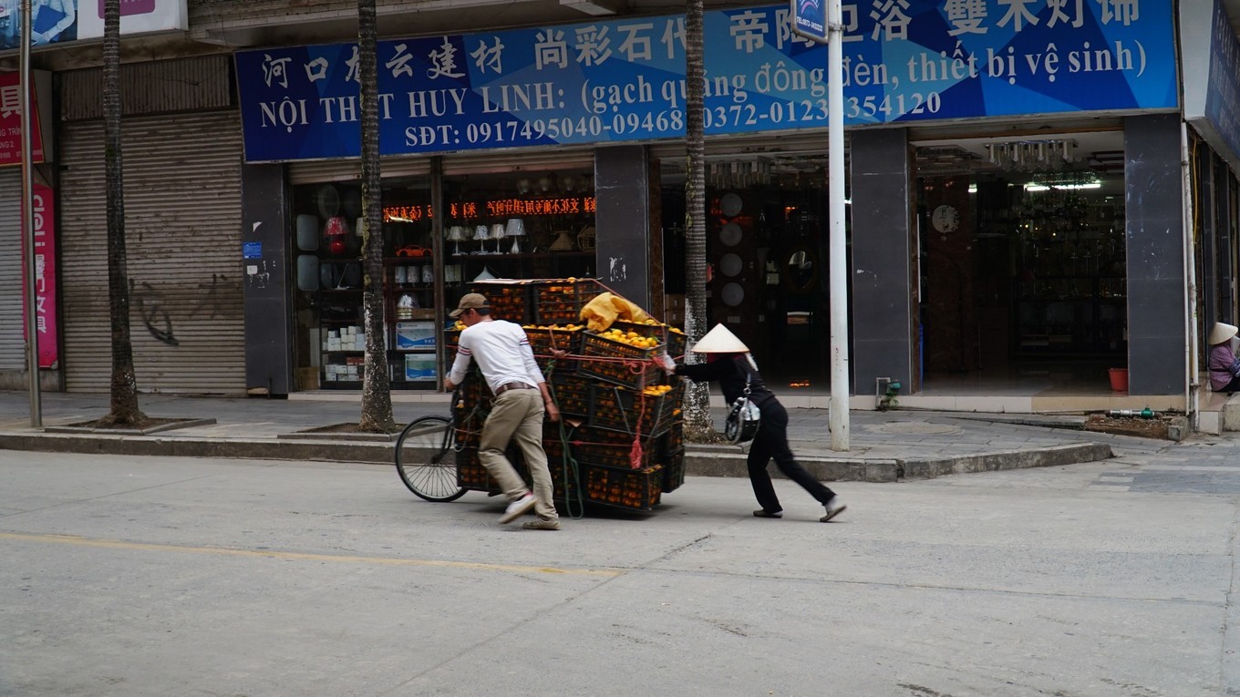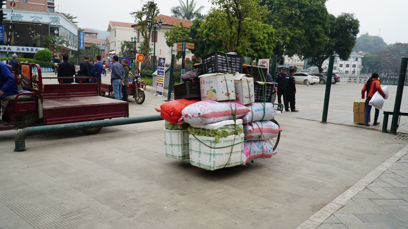 八点钟,口岸开关。我国这侧先开,越南那侧后开。 越南那侧打开,瞬间,推着自行车、电动车或是背着大背篓的越南商贩飞奔而来。车上背上沉重的货物与她们瘦弱的身体形成巨大的反差。而从我国一侧往越南去的,少部分是归国的越南人,大部分看上去像是去越南的游客,大都昂首挺胸缓步而行,与对面那些上身前倾负重飞奔的越南商贩形成鲜明对比。