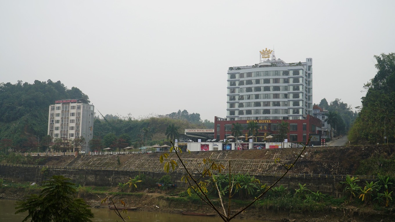 越南一侧的酒店。河这边我国一侧,滨河路上遍布着四五层的建筑,但没有高楼。而河对岸 越南一侧,只有一条沿河的公路,目之所及的范围内,只有一栋建筑,是一家酒店。山边一栋楼,此外再无其他建筑了。