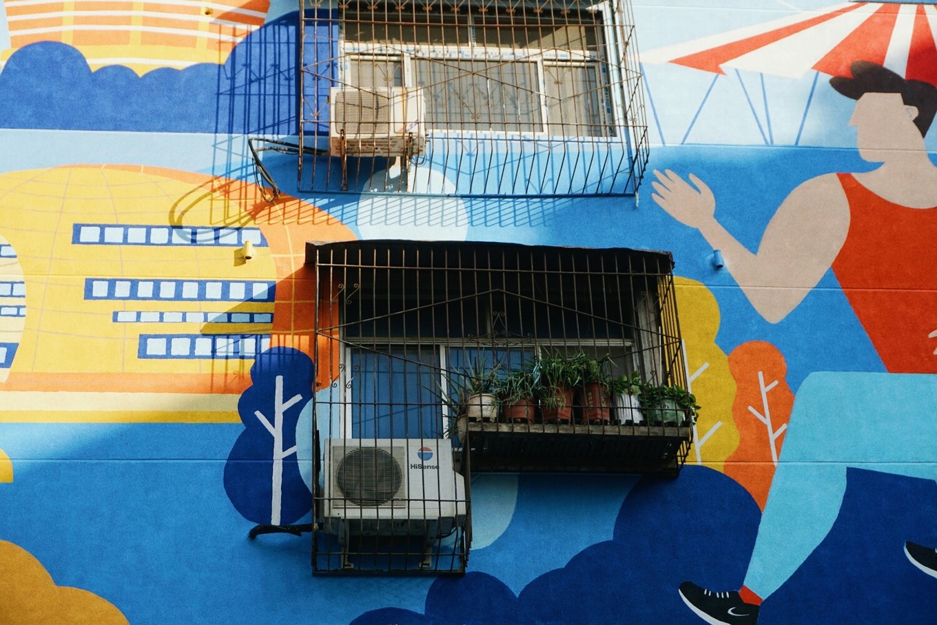 工厂藏在一个陈旧的巷子里,还没到门口,沿路的房子上就都是彩绘表现着郑州的特色。