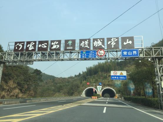 从205国道西行进入常山县境内,便是凉亭边隧道。隧道前的县界上空,悬挂着该县建设“国际慢城”的口号。