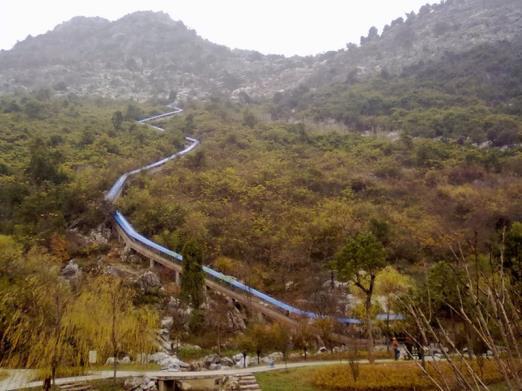 看见山上那条蜿蜒而下的蓝色建筑了吗?那是一条用花岗岩建造的滑道,登上山顶后,如果不想走路,可以从滑道上滑下,当然,那是要收费的。滑道被誉为“华东第一滑道”,长达1000米。