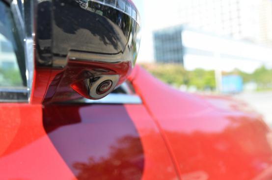 后视镜下隐藏了个摄像头,是360度全景影像的重要部分组成,前后左右各一个,实用性也是很高的,我在停车场倒车就可以在中控屏上看到四周的影像,还有俯视的效果。