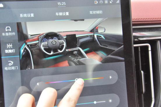 12英寸的中控屏也是很有亮点的,16种氛围灯颜色可选择,还能支持语音控制切换,这个语音控制能控制的东西还挺多的。