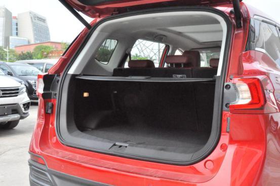 电动尾门打开后可见宽敞的后备箱空间,底部平整,容纳性大,还设置一块遮挡帘。