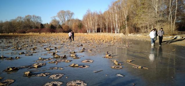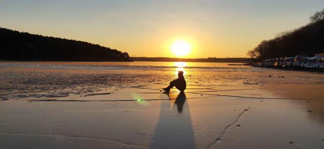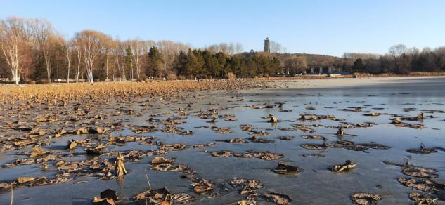 站在水库的湖面冰层上,