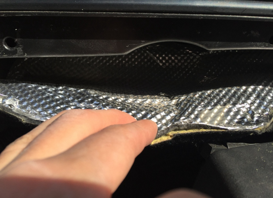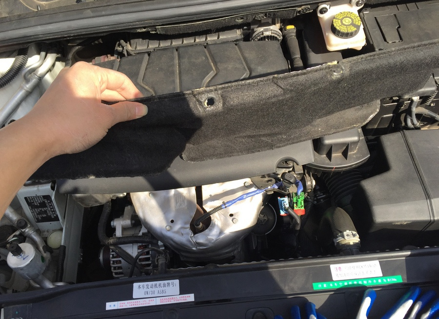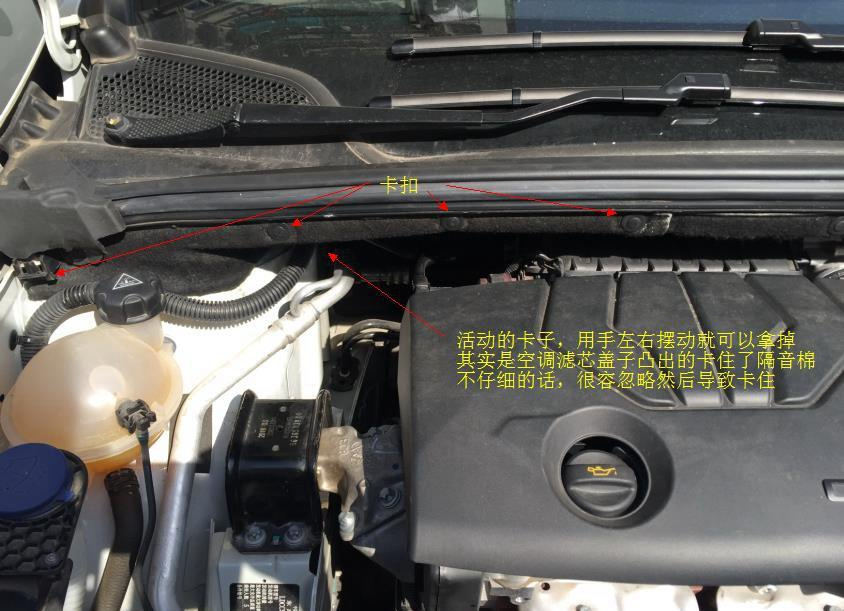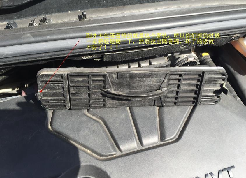 2、卡扣撬出来完了,然后轻轻掰动一下隔音棉,左右向外拉出来一点点,不能硬来。右手伸入其内摸一下,有个凸起,轻轻掰动一下这个凸起,左手顺势就把隔音棉拉出来了