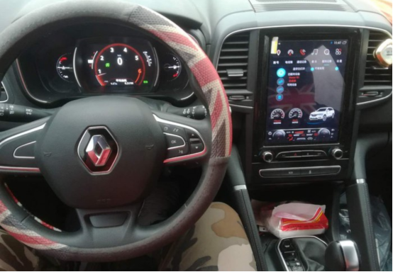 内饰一景,三幅式方向盘,竖式大屏集成于所有功能
