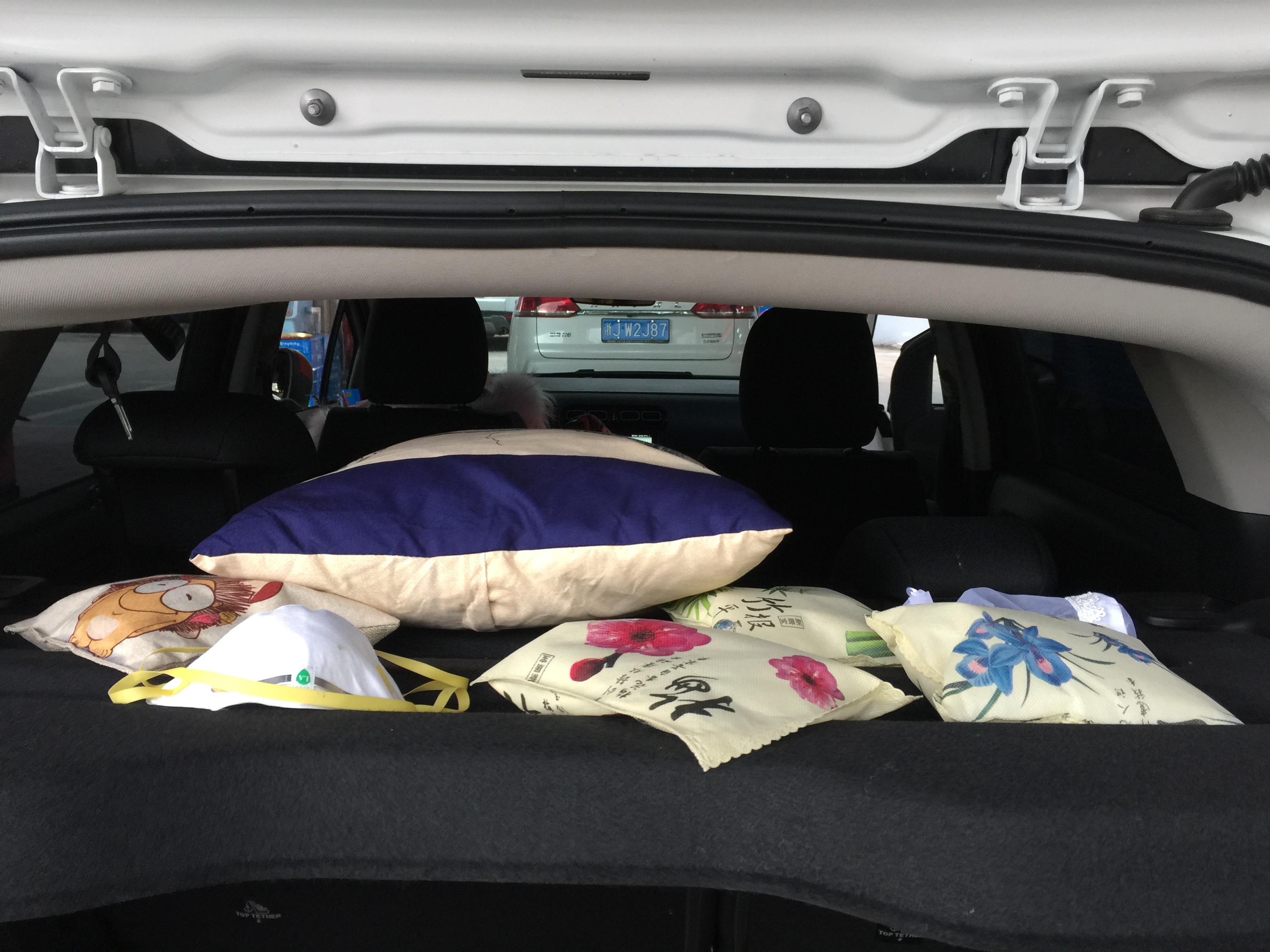 在没有找到合适的后备箱垫之前,用了纸板垫底,以防万一采购来的食材漏出水来臭味不能。