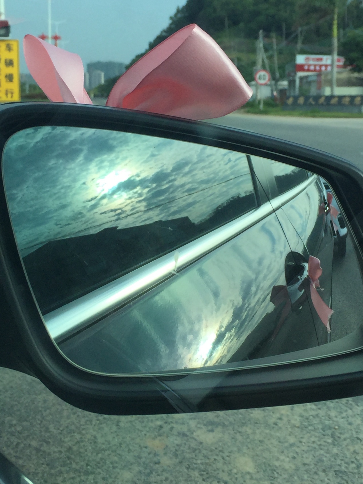 宽大的后视镜带上蝴蝶结