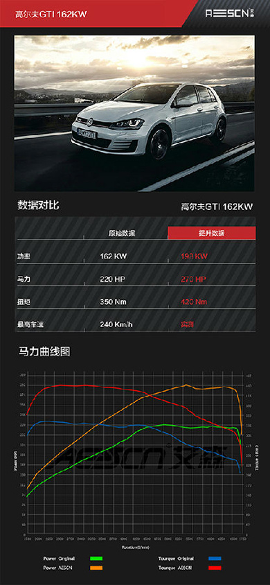 艾森发布高尔夫GTI程序定制方案: 一切以安全、稳定为前提,在不损伤发动机寿命提前下,将动力优化至最佳,同时符合车主的驾驶需求,性能参数如下: