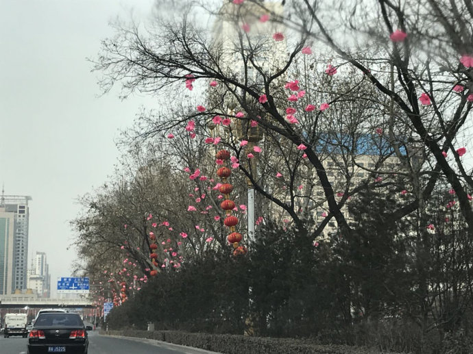 去晋祠的路上一路杏花相伴,一串一串的灯笼在风中飘荡,非常可爱。