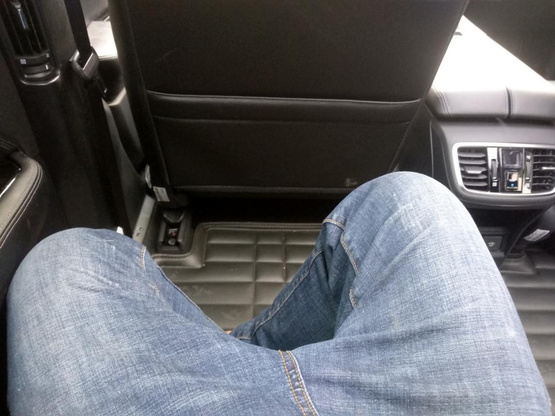 大家看,驾驶座的靠背已经调到扶手箱的最后了。前排已经是很宽敞的驾驶空间,在后排我可以任意姿势坐着,轻松的翘起二郎腿。这种空间感比很多中型SUV都好。