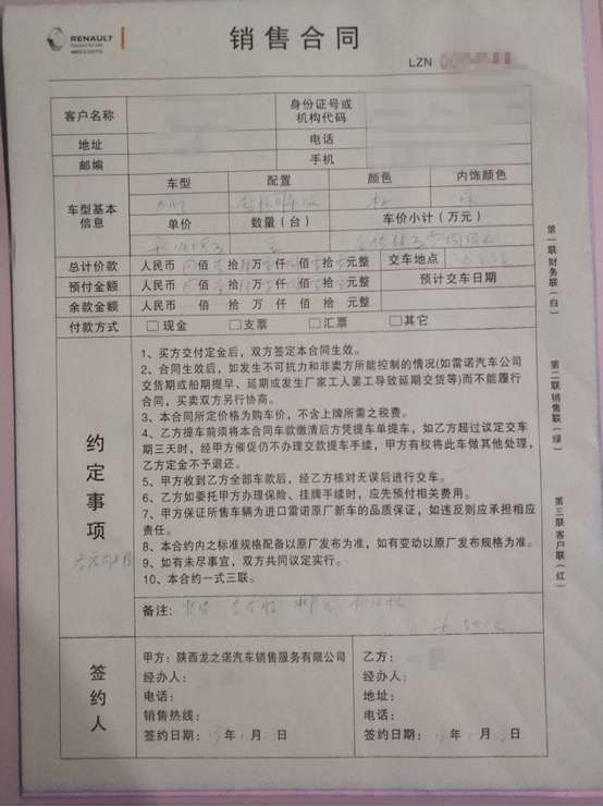 汽车城,网上到朋友那,这几天问了个遍。本田XRV和探歌,反复去4S店问,说提车至少要等到年后,没辙!指南者和新科雷嘉看的不多,属于优惠多,也有现车的新车,问了老婆说不太喜欢指南者的外形,所以最后目标落到了CVT+2.0L自吸的科雷嘉身上