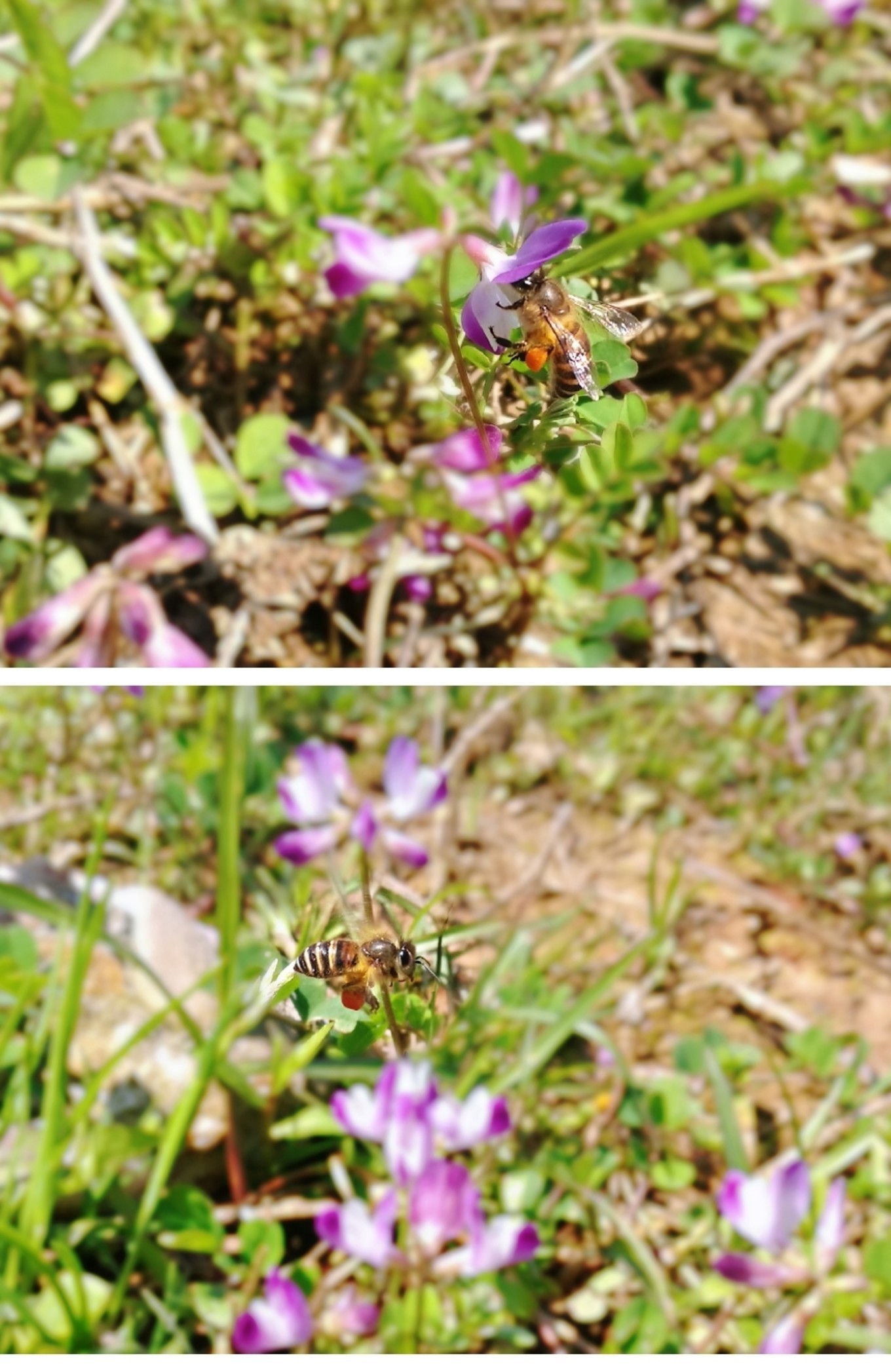 蜜蜂采花,腿上挂了一大坨的花粉包,收获满满