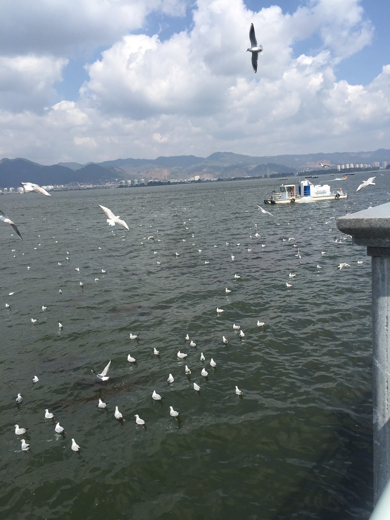 海埂大坝喂海鸥。买了20块钱面包由于风太大,扔出去的面包海鸥实在叼不到