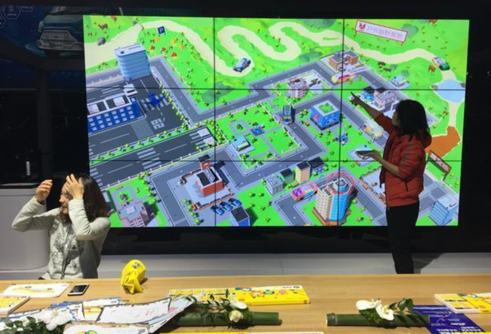 先用桌上的蜡笔涂绘你理想中的汽车配色,完成后扫描现场的二维码,这个电子屏就会把你画的汽车投递上去,你就能在屏幕中开车啦!