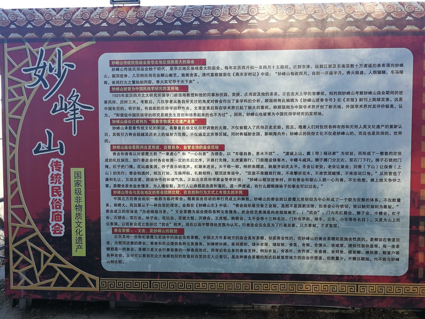 妙峰山最著名的事件是1925年顾颉刚等人在此完成了我国历史上的第一次民俗社会学调查,是我国民俗学的发祥地。