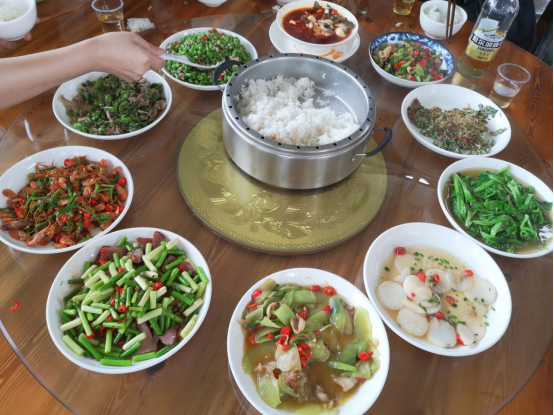 午饭,农家饭菜吃得有味,嫩桑叶煎蛋首次吃,老板还自己开船把我们送过河。