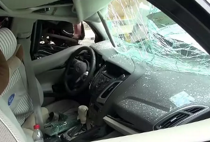 福克斯引擎盖已经被整片掀起,前挡风玻璃也已经支离破碎,内部空间变形不严重。
