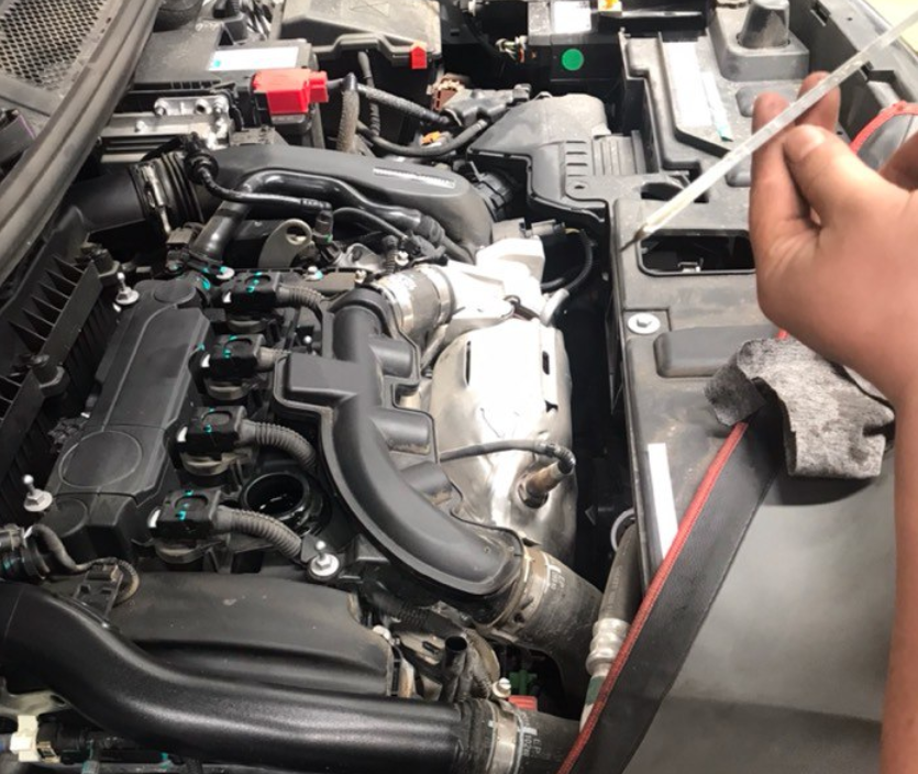 启动车子磨合了几分钟,又看了底壳下面有没有渗油,又拔出机油尺确认了油量