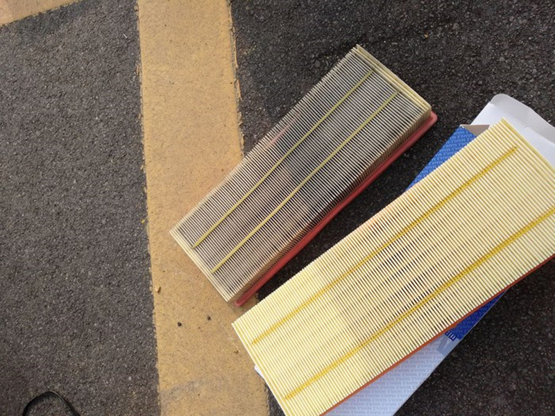 上边是拆下来的旧空气滤,下面是新的,对比一下