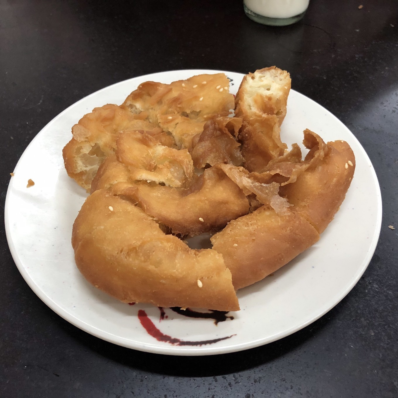 他家的招牌咸煎饼。我们进店,直接点了一份煎饼,要了两瓶冰豆奶。咸煎饼的外层香脆,里面香糯,二者搭配,味道很不错!