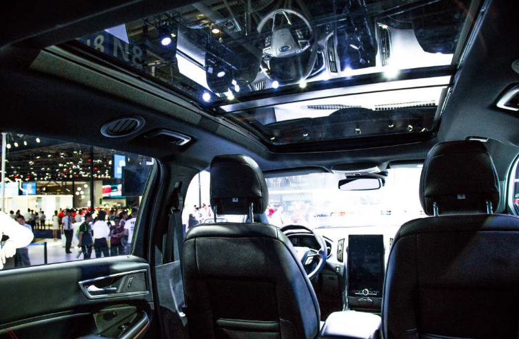 展馆光线太强,拍出来反光,不过还是可以看到电动全景天窗非常大,约会神器!晚上开出去露营,和老婆一起看星星,浪漫!