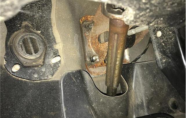 在弯腰检查座椅的同时,可以顺便看一下转向柱。车辆的转向柱往往不会有油漆覆盖,如果车内进水,那么转向柱的锈蚀将会非常明显。