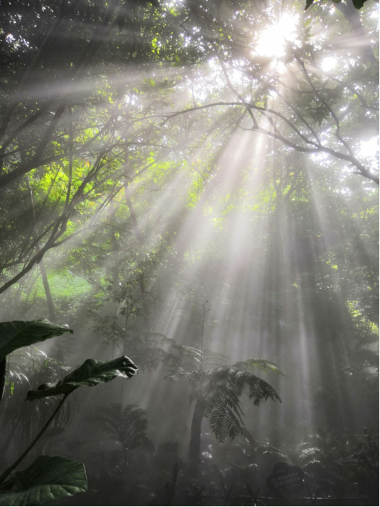 从科普馆沿主干道往上走过七八分钟就是热带雨林区,这个区域一直会噴白色的烟雾制造雨林的感觉。