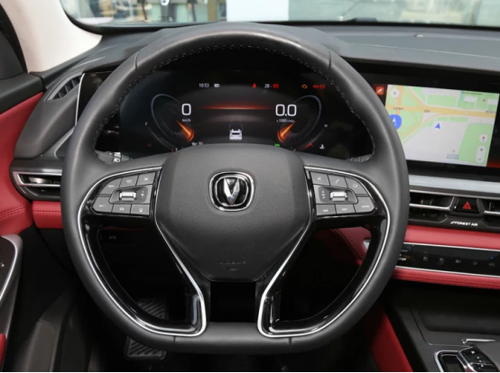 听销售讲这个是三联屏,中控屏+仪表屏+触控屏,基本上车辆的设置和搭载的智能系统都能通过三联屏来操控,还可以把导航界面飞屏到仪表屏上,非常的酷炫。